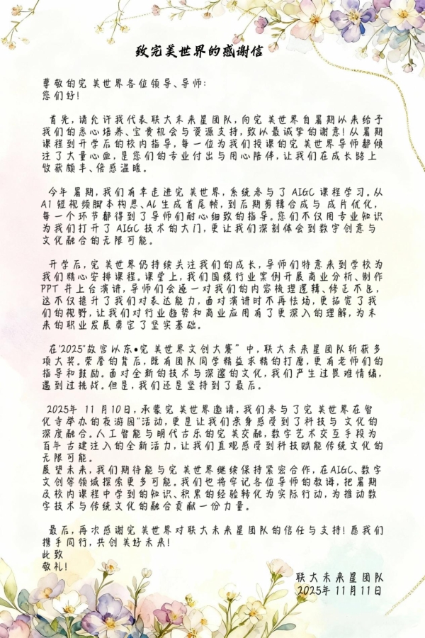 赛后,“联大未来星团队”向完美世界发出了情深意切的感谢信。信中回顾了从暑期aigc课程到开学后校内指导的成长历程,感谢完美世界导师们的悉心培养。“老师不仅用专业知识为我们打开了aigc技术的大门,更让我们深刻体会到数字创意与文化融合的无限可能。”