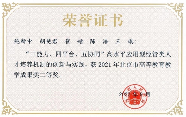 学院致力于构建高水平人才培养体系,其“三能力、四平台、五协同”经管类应用型人才培养模式荣获2022年北京市高等教育教学成果二等奖。学生在全国性及省部级竞赛中表现突出,累计获得国家级奖项169项、省部级奖项411项,其中在全国大学生电子商务“三创”挑战赛中的获奖数量稳居市属高校首位。学院连续五年有学生或团队斩获“校长特别奖”,获奖数量居全校第一。本科毕业生就业率稳定在96%以上,就业质量名列全校前三;考研录取率连续五年位列学校前三甲。121名学生获评“北京市优秀毕业生”,168人获市级优秀团干部称号,6个班集体荣获“北京先进班集体”。学院专业建设持续优化,“数智财管实验班”成功设立,四个专业入选国家级一流本科专业建设点,文化产业管理专业于2023年顺利增设,形成了结构合理、特色鲜明的专业布局。