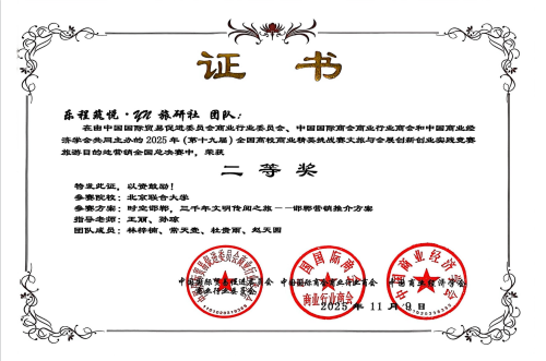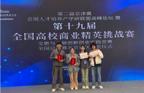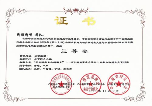 在孙琼和王丽老师的指导下,由林梓楠、常天壹等、赵天圆和杜贵雨同学完成的《时空邯郸——三千年文明穿阅之旅》项目荣获二等奖,该项目深度挖掘邯郸“三千年未改名”的独特历史ip,以创新文旅融合模式展现文化底蕴与市场潜力;王翀、牛艺晓、张欣雨和于琪同学完成的《苍岩颐养·山檀涧月——苍岩山康养旅游新业态策划案》获三等奖,聚焦康养新业态,为传统景区转型提供创见方案。
