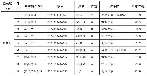 2、按照《2025年管理学院关于接收转专业学生要求的通知》中“2、拟接收转专业学生名额及相关平均学分绩点要求”和“3、考核及录取(2)录取原则”的规定,本次考核满足要求的学生为9人。